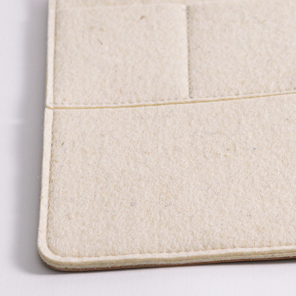 Unser 2mm dicker, langlebiger reiner Wollfilz wird aus Merinowolle hergestellt. Dieser Filz aus reiner Schafwolle ist ein seit Jahrtausenden bewährtes, hochwertiges Material, das auch nach vielen Jahren an den Kanten eines Taschenbegleiters nicht fusselt oder verschmutzt. Reine Wolle mit natürlichem Wollfett hat einen selbstreinigenden Effekt, ähnlich wie Seide.
