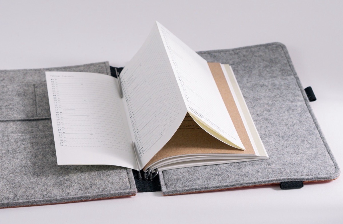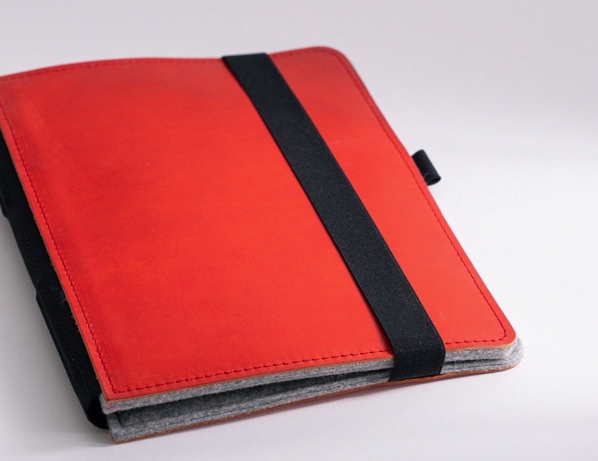 FORMAT 21 × 28 cm: Bei diesem Format sind die Klammern nicht bündig zur oberen und unteren Kante, sondern nach innen versetzt. Es passen optimal DIN A5 Hefte, aber auch das US Letter Format und andere Hefte bis B 20 × H 25 cm hinein. In beide Innentaschen passen Tablets bis 18 × 26 cm.
