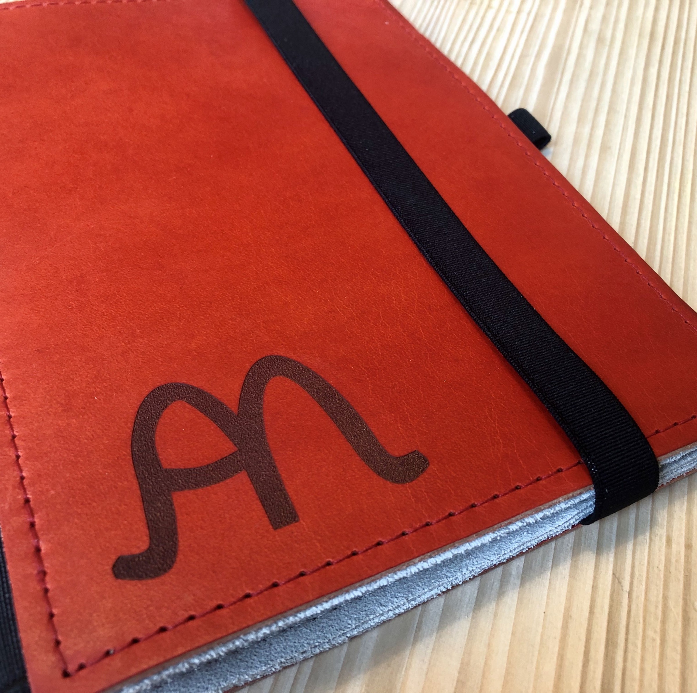 Eine Lasergravur erfolgt farblos. Der Laser brennt dabei in die oberste Materialschicht und hinterlässt eine präzise Vertiefung. Es können alle ROTERFADEN Außenmaterialen graviert werden. Möglich ist eine Gravur »Bild« oder »Text«.